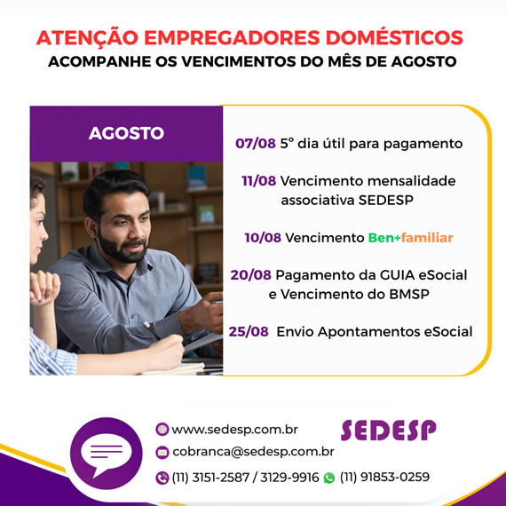 29/07/2025 - Calendário de AGOSTO para o Empregador Doméstico